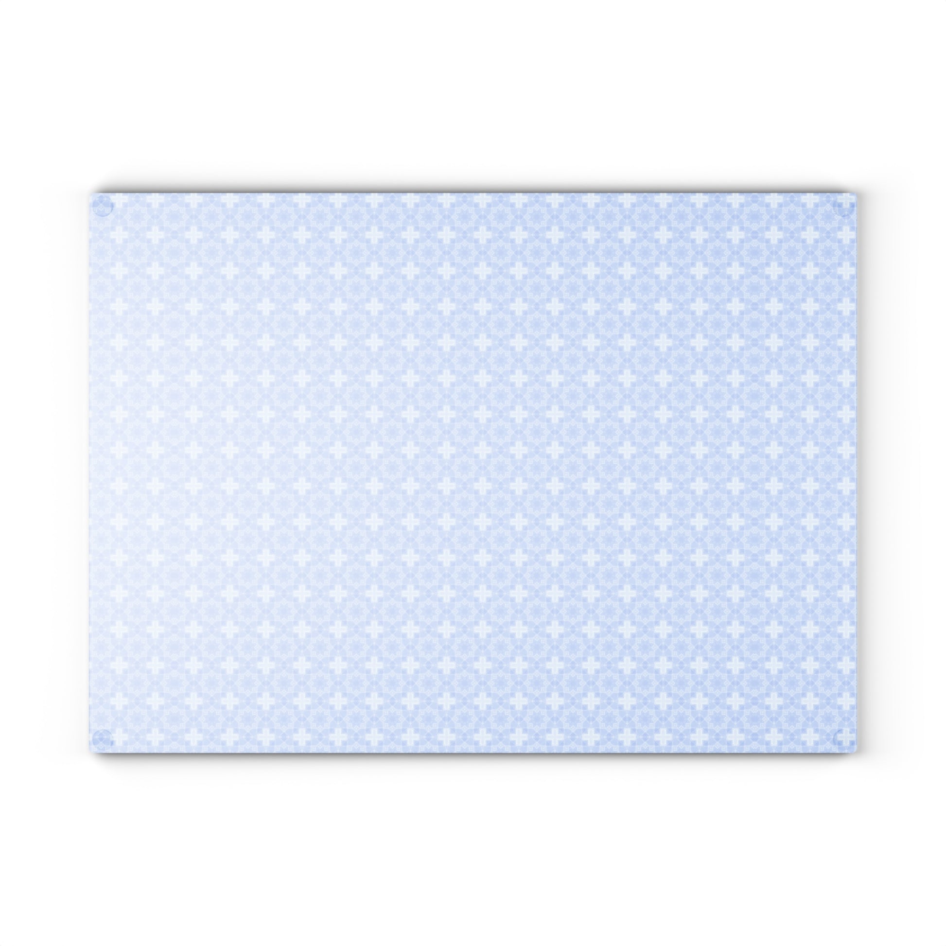A sleek tempered glass cutting board with a soft blue geometric pattern that brings calm and subtle style to your kitchen. The textured surface and durable printing keep the design vivid through daily use while the four rubber feet hold the board steady on countertops. Lightweight yet sturdy, it’s easy to move during prep and sits neatly against other kitchen tools. Choose between two compact sizes that fit tight prep spaces or small kitchen islands. Hand wash recommended to preserve color and finish.