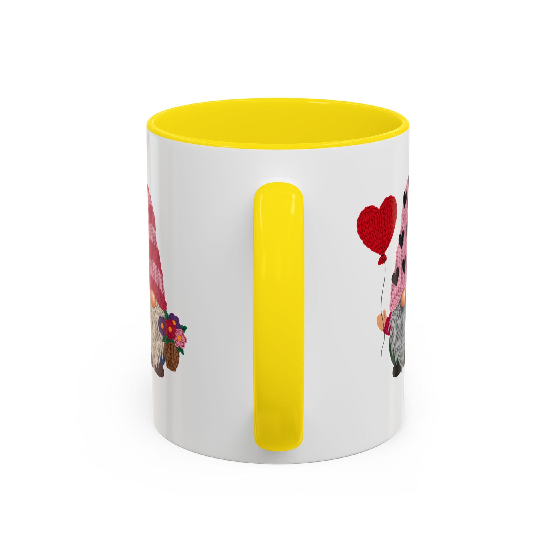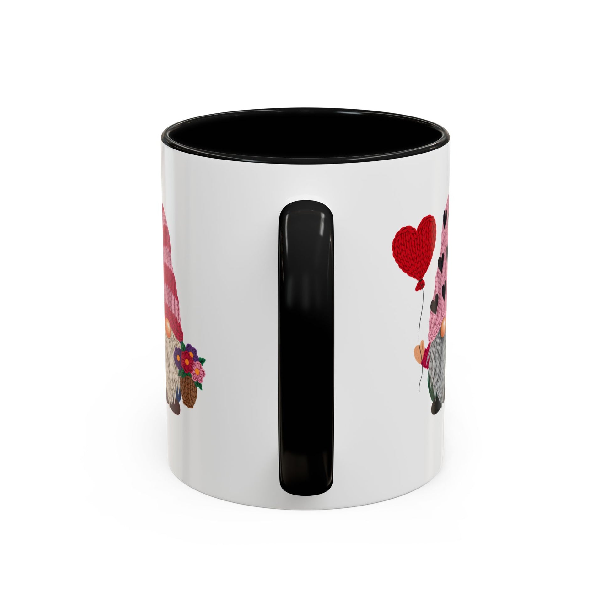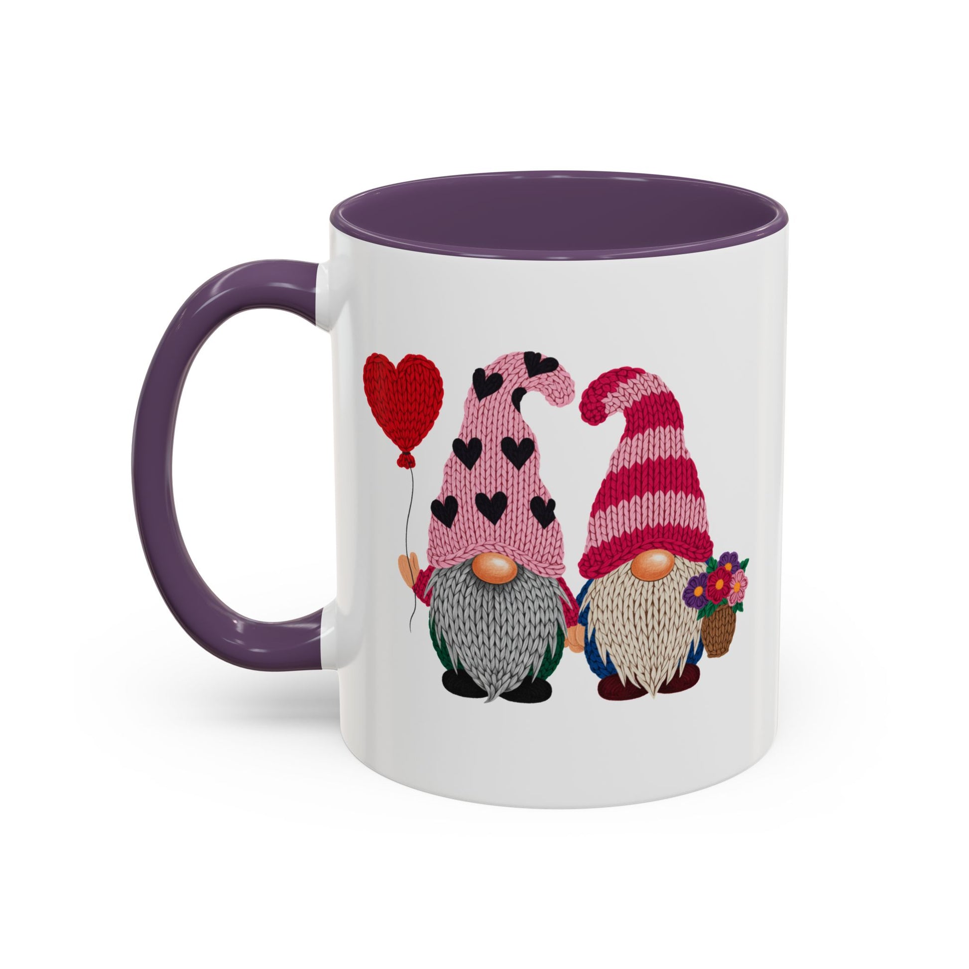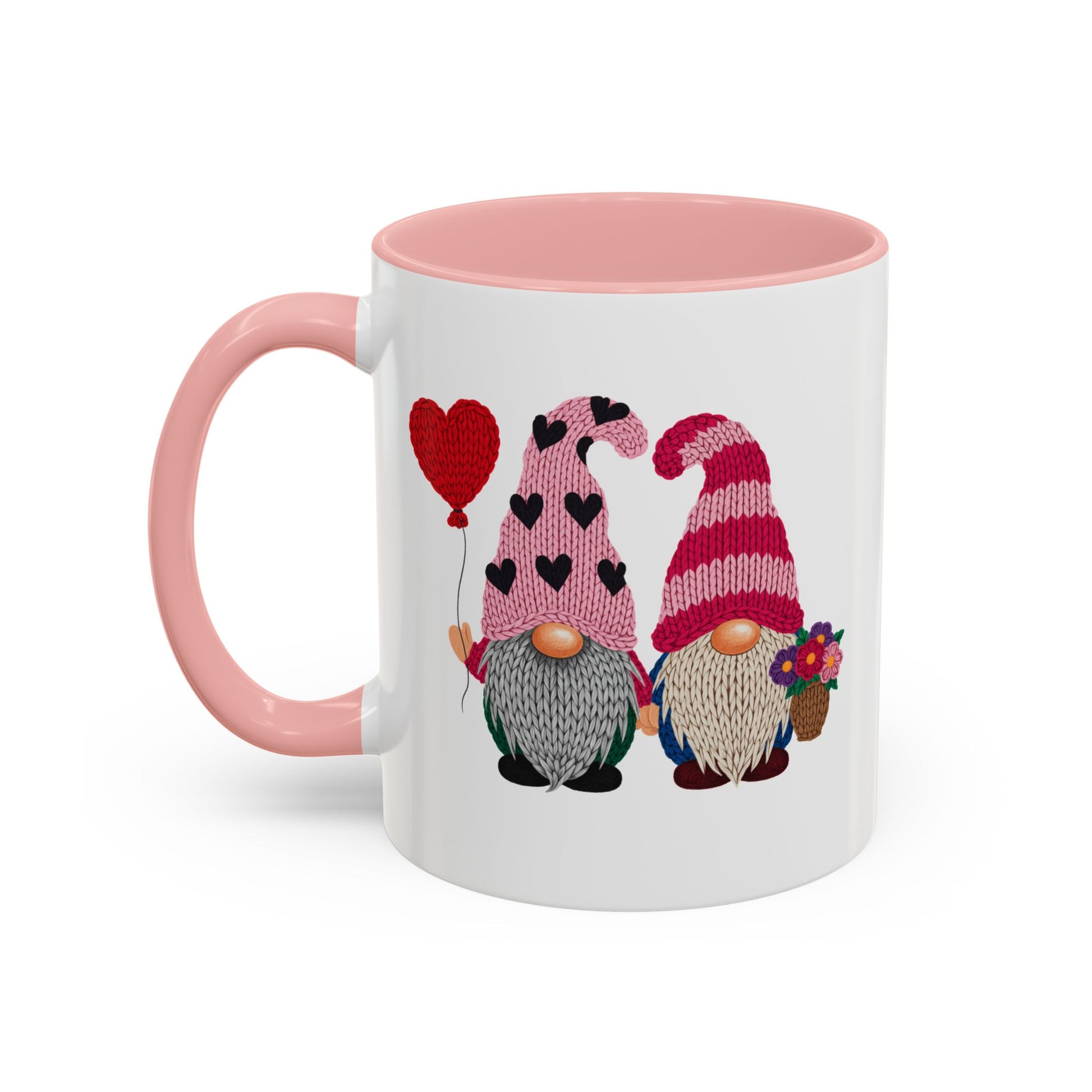 Warm mornings, shared smiles. This ceramic mug features two adorable Valentine gnomes—one holding a heart balloon, the other with a little bouquet—set against a crisp white background and framed by a contrasting colored interior and handle. The glossy finish makes the bright pinks and reds pop, while the comfortable C-shaped handle keeps your grip steady through slow sips and heartfelt conversations. Whether it lives on your kitchen counter or the office desk, this mug brings a cozy, whimsical touch to quiet rituals and celebratory moments alike.